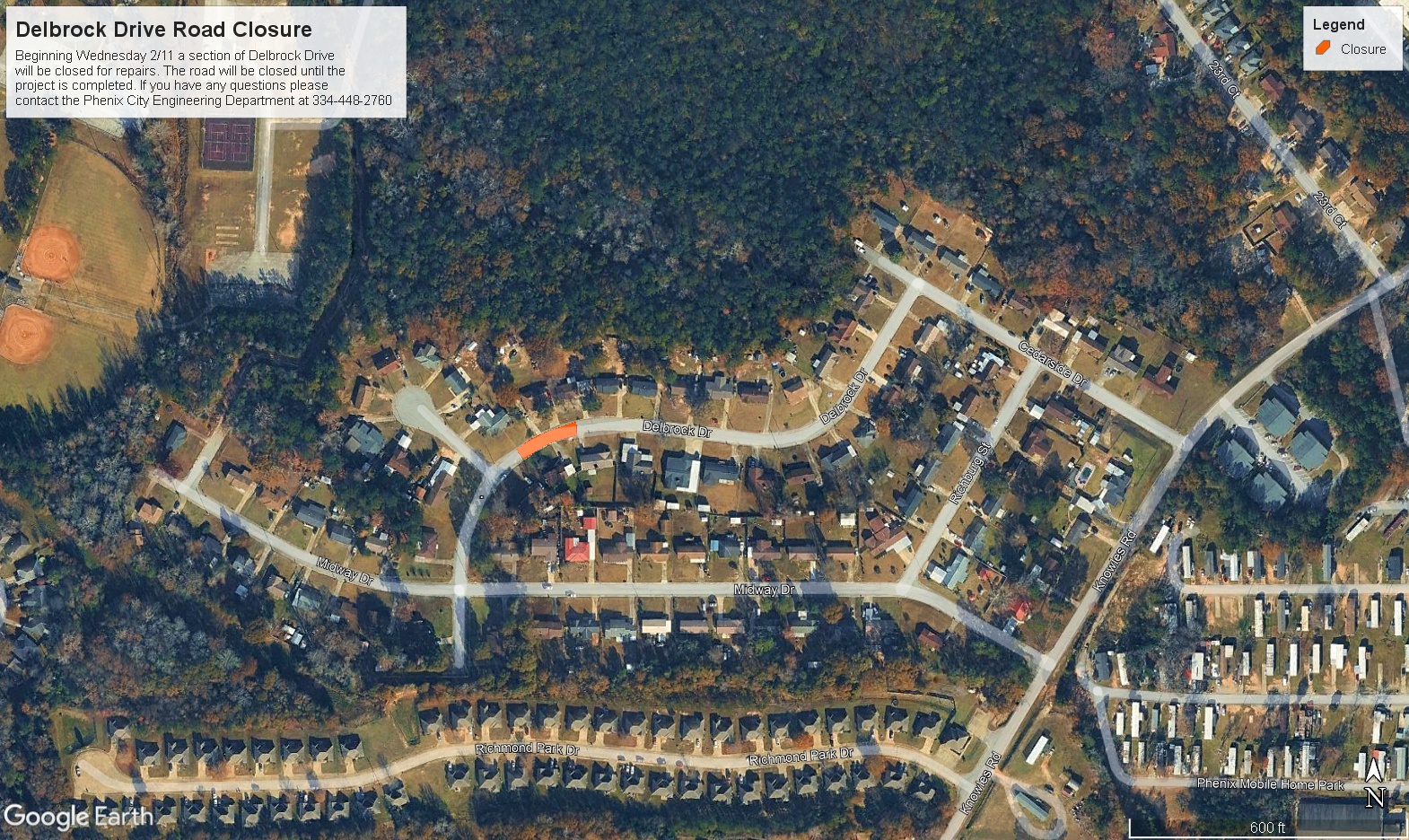 The Phenix City Utilities Department is performing emergency utility repairs on a section of South Railroad Street between 17th Avenue and 14th Court. The road will be closed effective immediately and is expected to last until the project is finished. A detour will be in effect routing traffic around the work. Dates and times are subject to change due to weather. During this time, delays should be expected, and travel times adjusted accordingly. Thank you for your cooperation. You may contact the Phenix City Utilities Department at 334-448-2880 with any questions.
