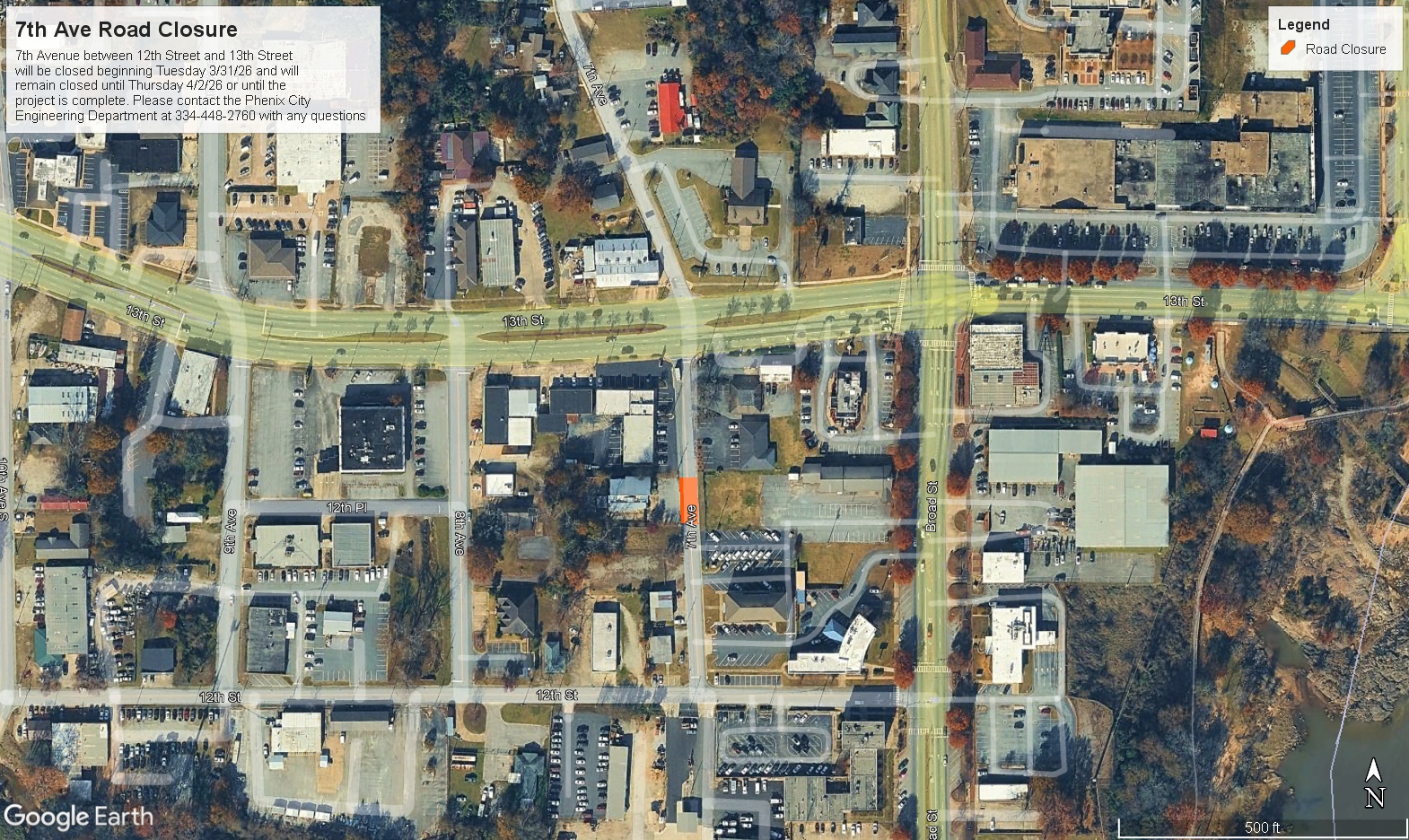 A contractor will be closing both lanes of 7th Avenue between 12th Street and 13th Street. The road will be closed Tuesday March 31st and is expected to last until Thursday April 2nd or until the project is finished. A detour will be in effect routing traffic around the work. Dates and times are subject to change due to weather. During this time, delays should be expected, and travel times adjusted accordingly. Thank you for your cooperation. You may contact the Phenix City Engineering Department at 334-448-2760 with any questions.