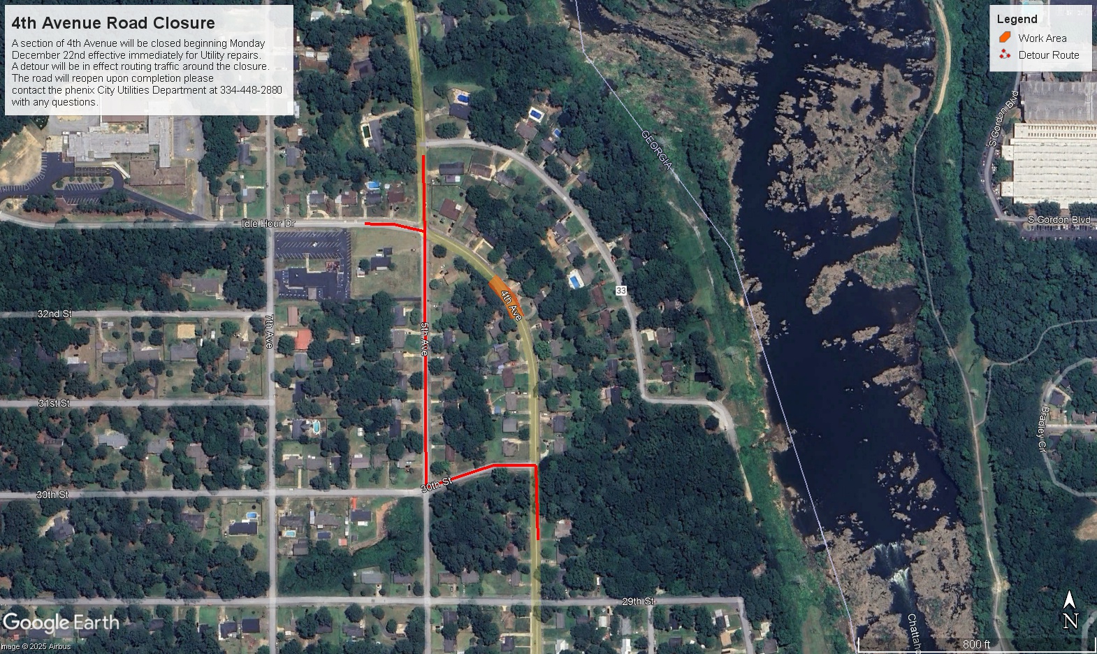A contractor working for the Phenix City Utilities Department will be working on a section 4th Avenue between 30th Street and 5th Avenue. That section of the road will be closed and a detour will be in effect routing traffic around the work. The closure is to begin Monday December 22nd and is expected to last until the project is finished. Dates and times are subject to change due to weather. During this time, delays should be expected, and travel times adjusted accordingly. Thank you for your cooperation. You may contact the Phenix City Utilities Department at 334-448-2880 with any questions.