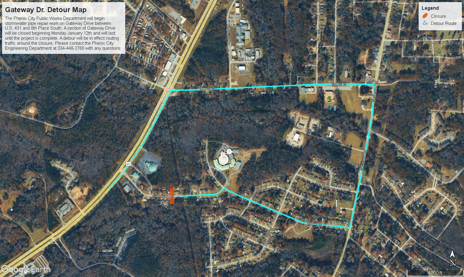 The Phenix City Public Works Department will begin stormwater pipe repair work on Gateway Drive between U.S. 431 and 8th Place South. A section of the road will be closed and a detour will be in effect routing traffic around the work. The road will be closed beginning Monday January 12th and is expected to last until the project is finished. Dates and times are subject to change due to weather. During this time, delays should be expected, and travel times adjusted accordingly. Thank you for your cooperation. You may contact the Phenix City Engineering Department at 334-448-2760 with any questions.