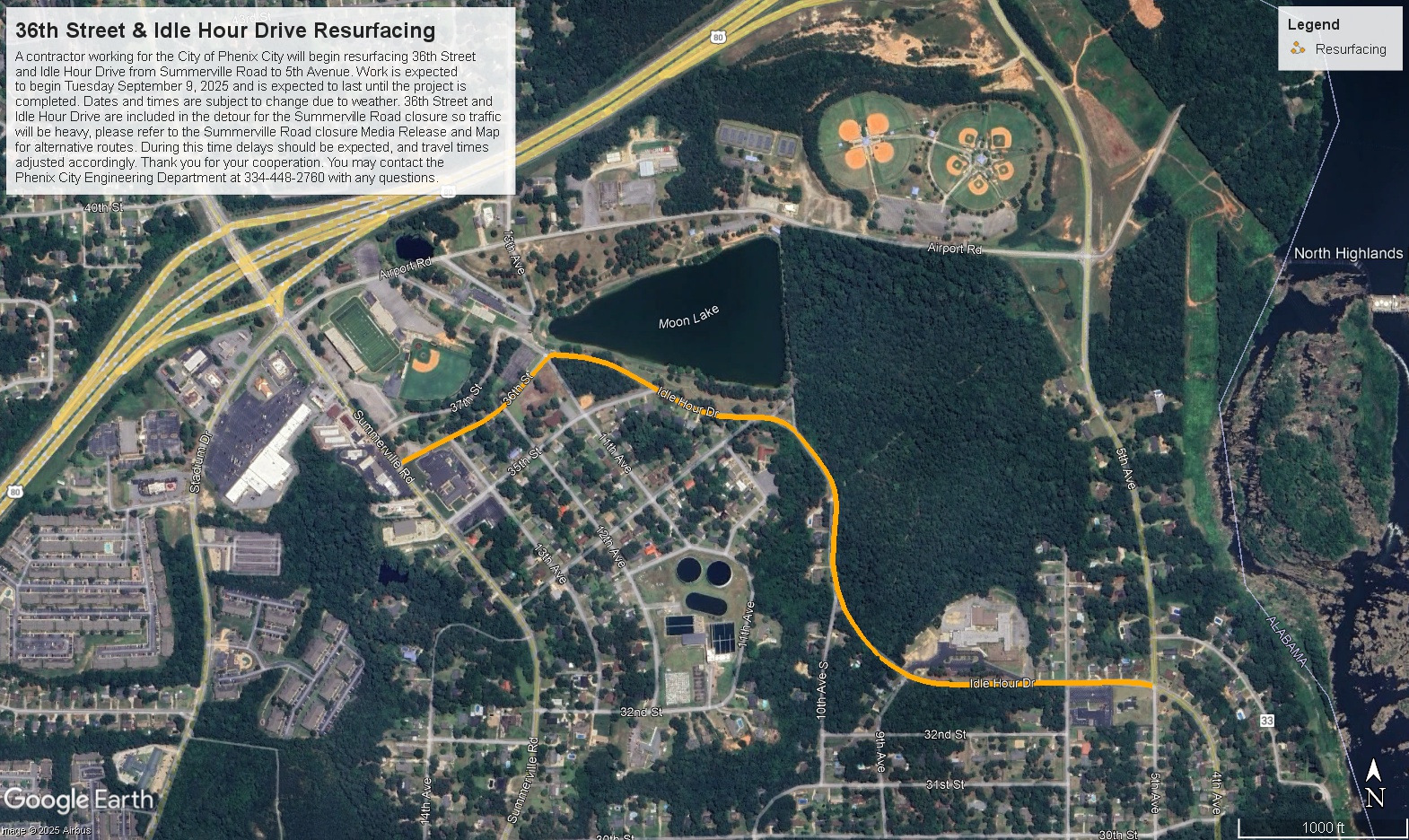 A contractor working for the City of Phenix City will begin resurfacing 36th Street and Idle Hour Drive from Summerville Road to 5th Avenue. Work is expected to begin Tuesday September 9, 2025 and is expected to last until the project is completed. Dates and times are subject to change due to weather. 36th Street and Idle Hour Drive are included in the detour for the Summerville Road closure so traffic will be heavy at times, please refer to the Summerville Road closure Media Release and Map for alternative routes. During this time delays should be expected, and travel times adjusted accordingly. Thank you for your cooperation. You may contact the Phenix City Engineering Department at 334-448-2760 with any questions.